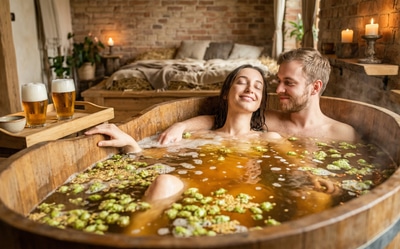 Arrive about 10–15 minutes early – enough time to change and settle in. Our specialist will walk you to your room and add the ingredients to the tub right before your eyes: Žatec hops, malt, and brewer's yeast for the beer bath, or grape extracts, honey, and lavender for the wine bath. Nothing pre-mixed – everything fresh, done in front of you.